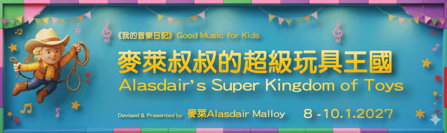 Dear lovers of toys, games and all things fun, you are cordially invited to visit Alasdair’s magical, whimsical, fantastical Super Kingdom of Toys! Here, all merriment runs on the power of music – you can march with the toy soldiers from Tchaikovsky’s The Nutcracker, sing your doll a lullaby by Fauré, join an epic spinning top battle commentated by Bizet’s music, and groove to favourite tunes from Toy Story, Thomas the Tank Engine and more. Dress up as any character or toy you like, and meet Hong Kong Sinfonietta in the concert hall – it’s PLAYTIME!