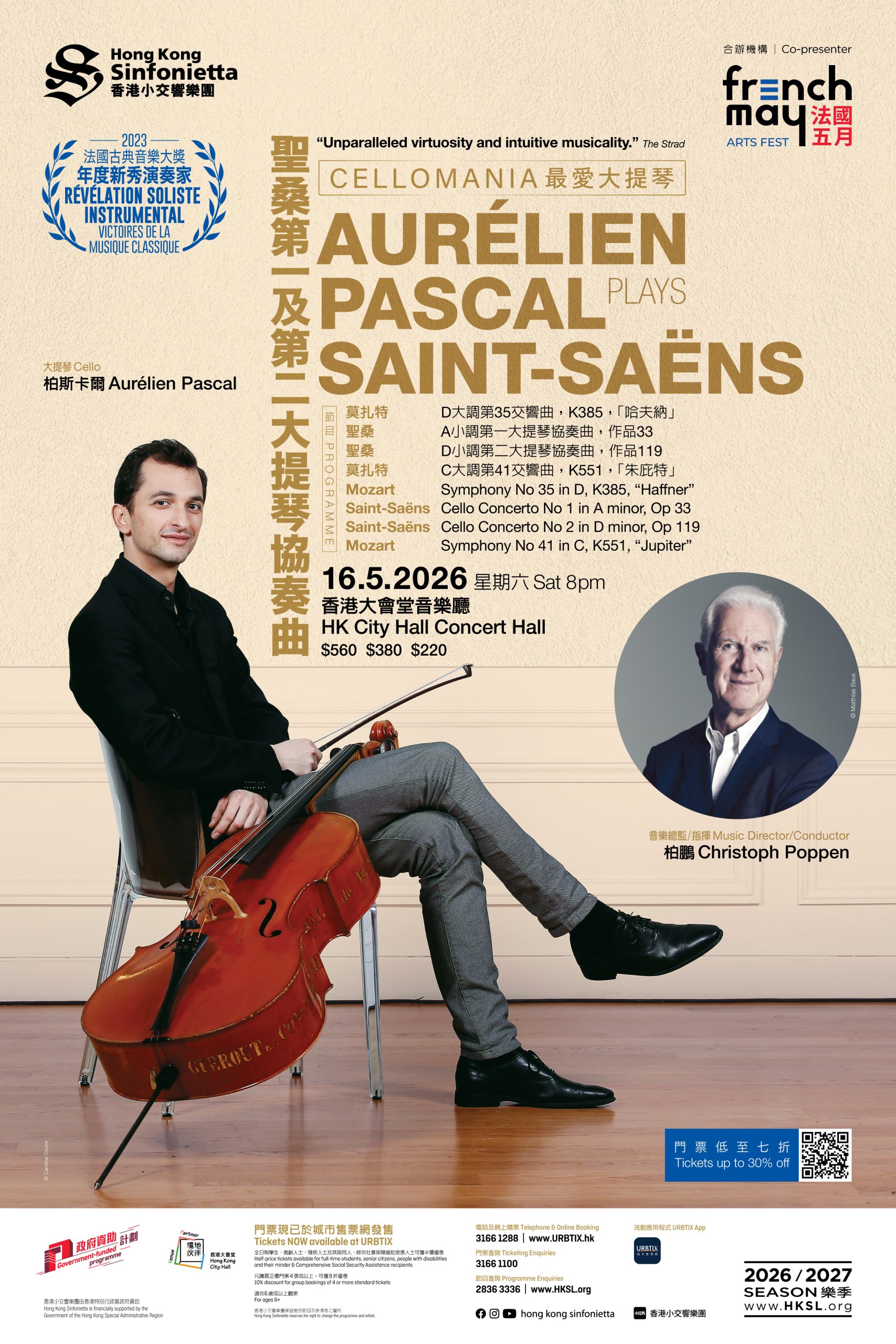 “Révélation Soliste Instrumental” at the 2023 French Victoires de la Musique Classique and prizewinner at the 2017 Queen Elisabeth Competition, French cellist Aurélien Pascal is a force of nature in today’s music scene and no new discovery for the Hong Kong audience, having delivered absolutely enthralling performances with Hong Kong Sinfonietta on each visit since his début in 2015. He returns for another much-anticipated collaboration, this time presenting a double bill of Saint-Saëns’ two cello concertos, bookended by Mozart’s timeless “Haffner” and “Jupiter” symphonies under the authoritative baton of Music Director Christoph Poppen.