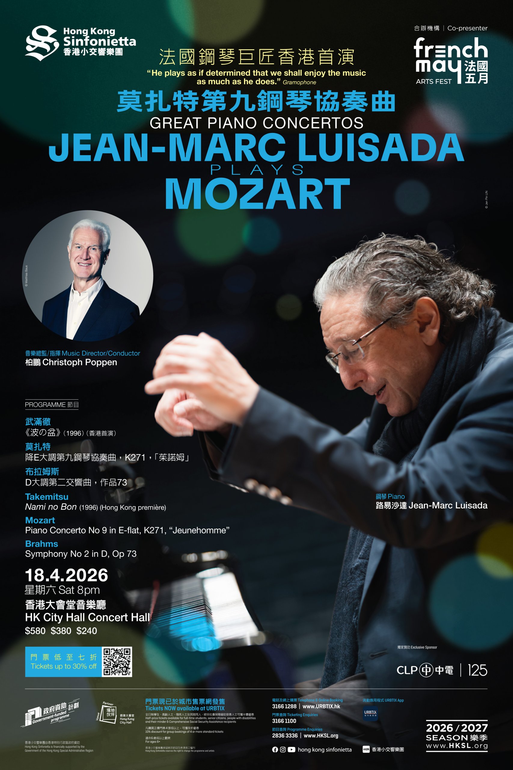 Luisada will be making his long-overdue Hong Kong début under Hong Kong Sinfonietta’s invitation for its season-opening concert with Music Director Christoph Poppen on 18 April. Mozart’s luminous and spirited Piano Concerto No 9, “Jeunehomme” will be the centrepiece of the evening of orchestral splendour, while a fine selection of classics by Chopin, Haydn and Debussy will feature in Luisada’s solo recital the day after (19 April).