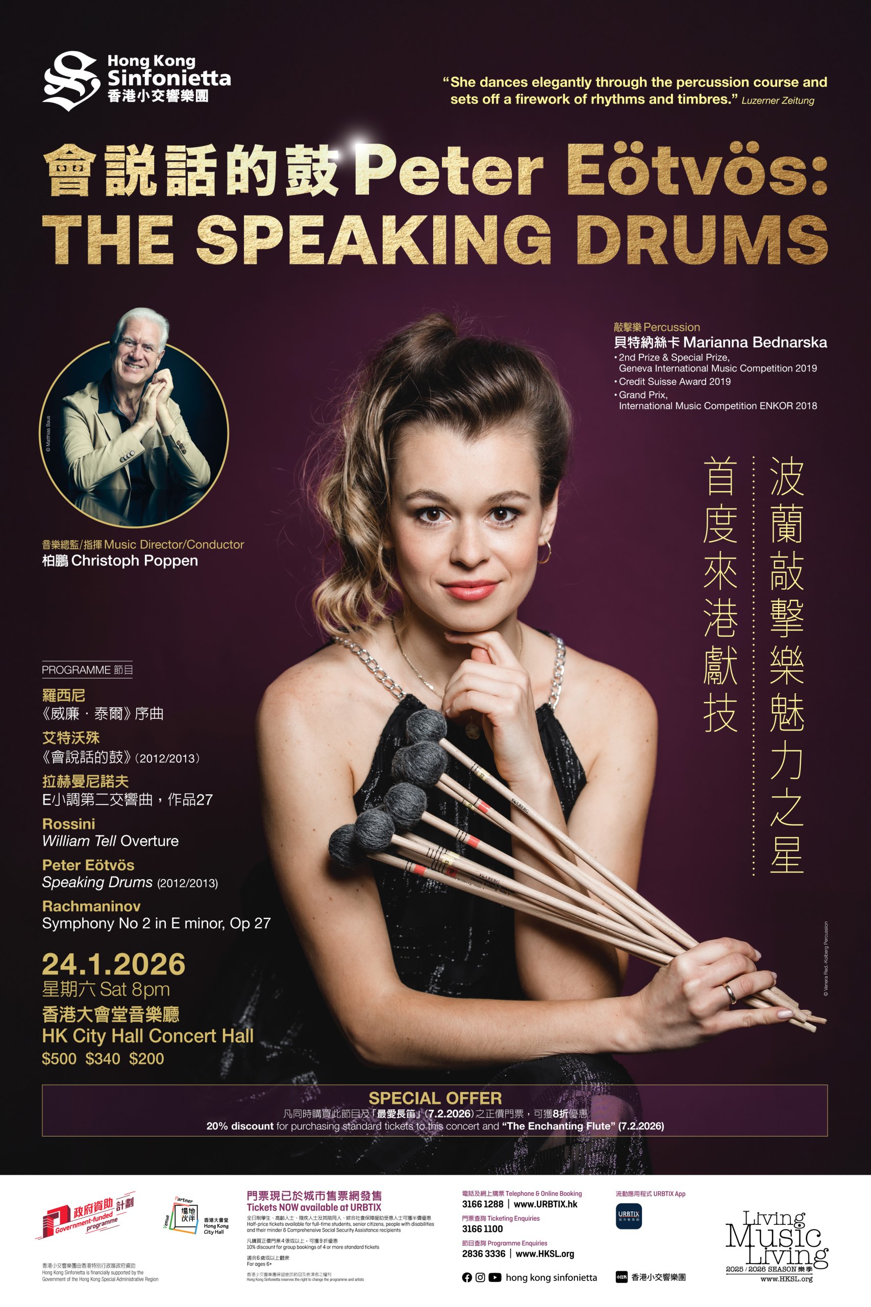 Having enjoyed a meteoric rise on the international concert platform since winning 2nd Prize at the prestigious Geneva International Music Competition in 2019, Polish star percussionist Marianna Bednarska is bringing her electrifying performances to Hong Kong for the very first time. Joining hands with Hong Kong Sinfonietta and Music Director Christoph Poppen, she will present monumental composer Peter Eötvös’ Speaking Drums – an instantly captivating masterpiece utilising an impressive range of percussion instruments as well as the versatile human voice; the result is marvellous musical storytelling exploring the primal connection between music and speech. Rossini’s beloved William Tell Overture will start the concert, and Rachmaninov’s towering symphonic achievement – the sublime Symphony No 2 – will conclude the unmissable programme.