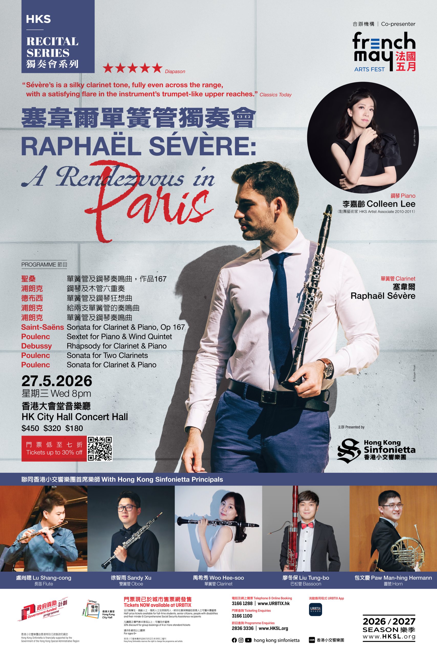 今年法國五月藝術節,香港小交響樂團再度邀請深受觀眾愛戴的單簧管明星塞韋爾訪港,並帶來兩場精彩節目。塞韋爾的演奏極具感染力,年僅15歲已獲提名法國古典音樂大獎,迅速躍升為歐洲最受矚目的單簧管演奏家之一。除了將於5月30日與香港小交響樂團合作演奏尼爾森的單簧管協奏曲外,他亦會於5月27日晚上聯同星級鋼琴家李嘉齡及樂團多位首席樂師,帶領觀眾踏上一趟跨越百年巴黎的音樂旅程 ── 從聖桑古典優雅的調子、德布西如霧似光的音色,到浦朗克充滿靈動與詩意的樂句,邀請樂迷在音符之間與他相遇巴黎。