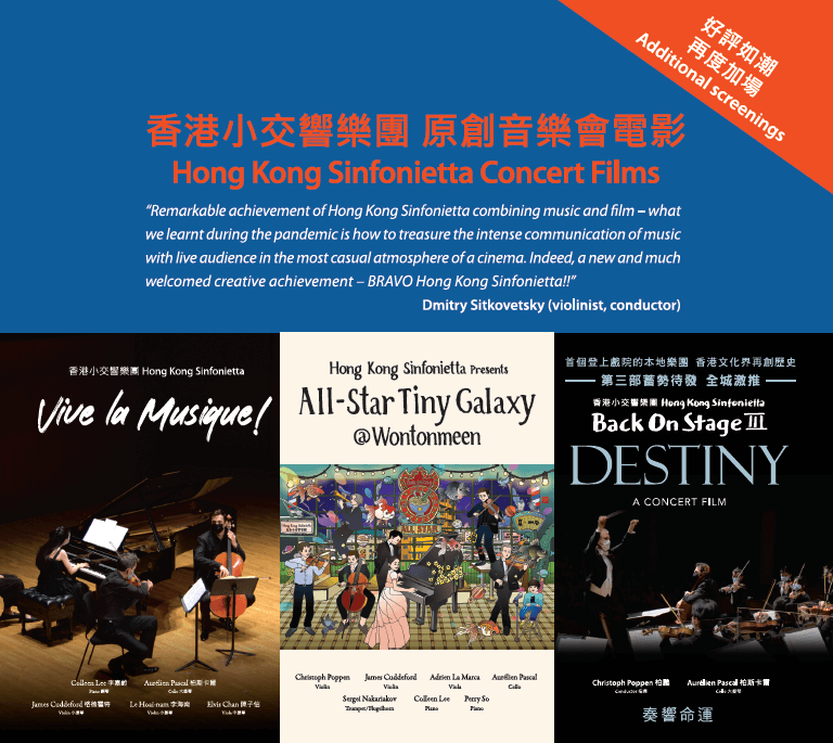 2020年疫情期間,香港小交響樂團於表演場地尚未開放予現場觀眾之際,破天荒於香港大會堂音樂廳拍攝了首齣音樂會電影,其後更推出了以嶄新4K技術製作的《Back On Stage》音樂會電影系列。樂團亦突破場域與界限,首度與MOViE MOViE戲院合作,成為首個登上大銀幕的本地樂團,第二齣音樂會電影《Back On Stage II (Quarantined!)》上映超過20場,不但數度加場、口碑載道,更衝出香港,連同系列首部曲《Back On Stage音樂會》於台灣首映。2021年,香港小交響樂團與MOViE MOViE聯合策劃「Life is Art盛夏藝術祭」電影節,並由樂團最新製作《Back On Stage III: DESTINY》揭開序幕,是次合作亦成為香港電台第四台「2021十大樂聞」之一。電影節同時為觀眾帶來樂團其他新作的世界首映,包括以室樂作品為主打的《Vive la Musique!》,以及雲集多位星級音樂家於深水埗極具特色的「Wontonmeen」旅舍演奏的《All-Star Tiny Galaxy@Wontonmeen》,透過電影的細膩鏡頭,展現古典音樂的無限可能性。
